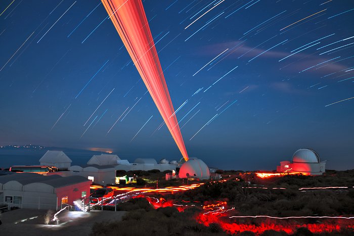 Laser im Test: Am Teide-Observatorium auf den Kanarischen Inseln testen Wissenschaftler die Laserleitsterne des ELT. Einer davon ist in dieser Langzeitbelichtung zu sehen.