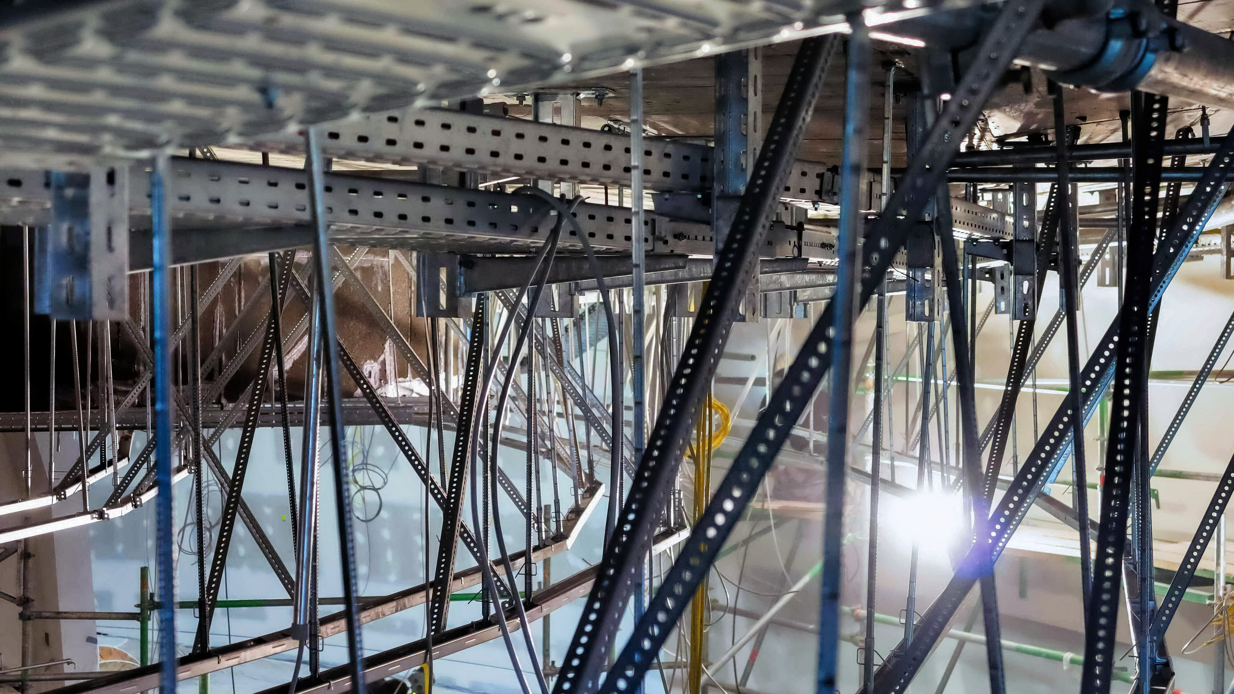 This image shows the inside of the lamella ceiling, which gives the ESO Supernova centre a futuristic atmosphere.